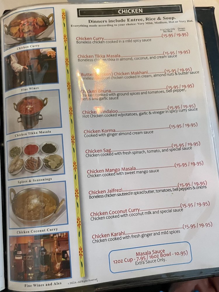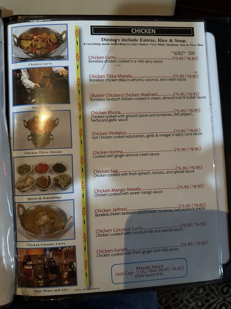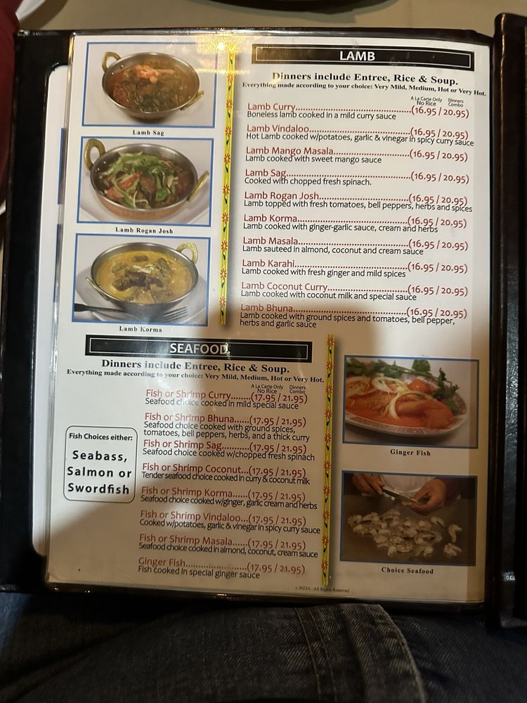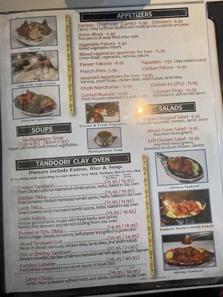 1/2 chicken tandoori, chicken or lamb curry, and mix vegetable curry, rice and naan bread.