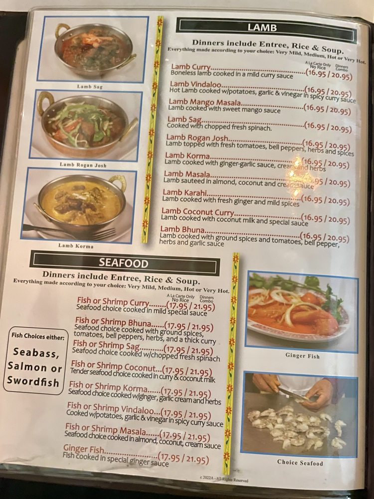 Soup or salad, half chicken tandoori, lamb biryani, vegetables and naan bread.